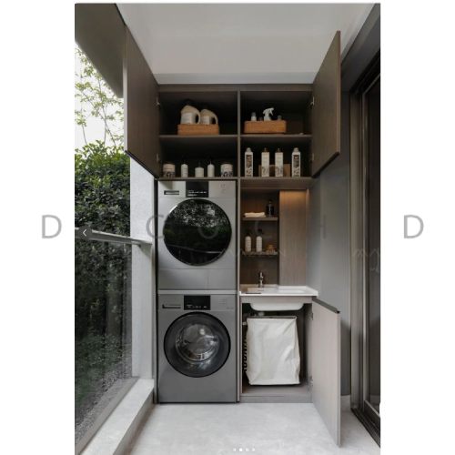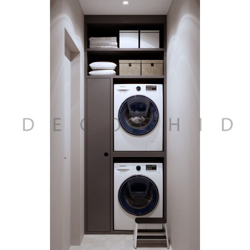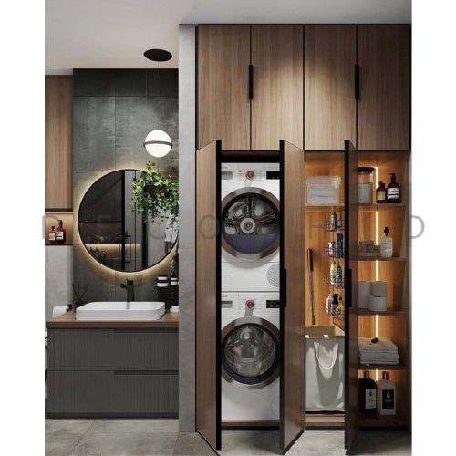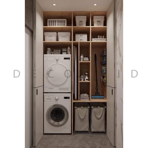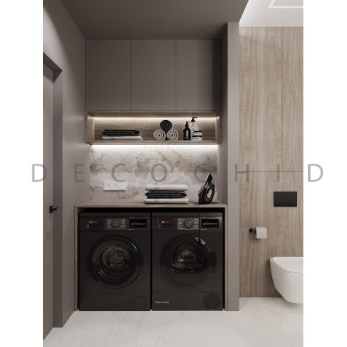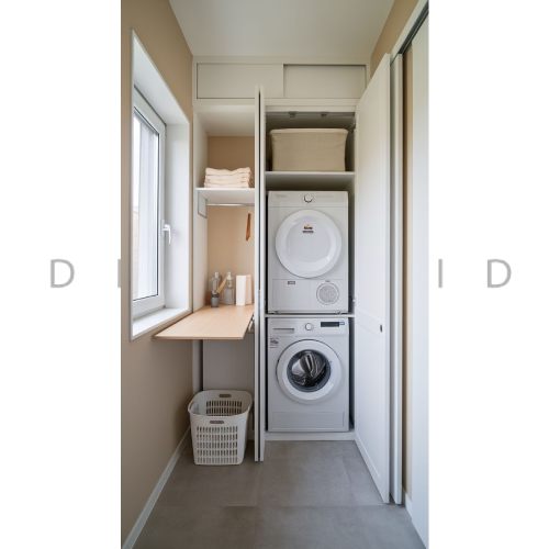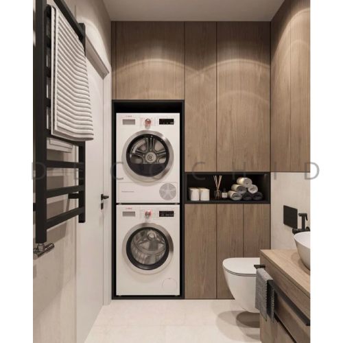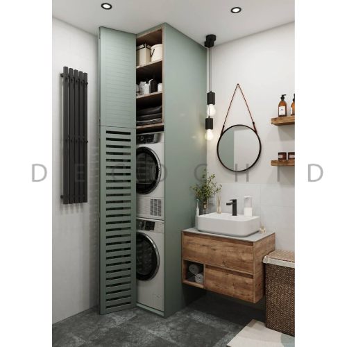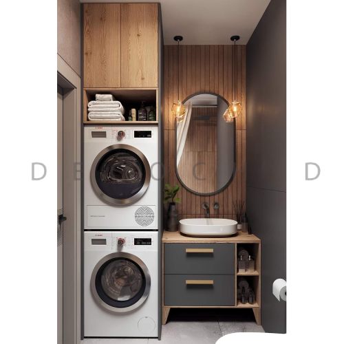 - استفاده از زیرپله: نصب لباسشویی + خشککن روی هم + کشوهای زیر پله برای ذخیره مواد شوینده
